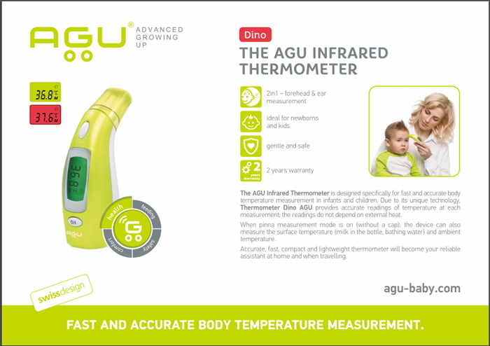 Nhiệt kế hồng ngoại AGU Dino được thiết kế đặc biệt để đo nhiệt độ cơ thể nhanh và chính xác ở người lớn và trẻ em. Do công nghệ độc đáo của nó, nhiệt kế cho kết quả đo chính xác ở mỗi lần đo; kết quả không phụ thuộc vào nhiệt bên ngoài.