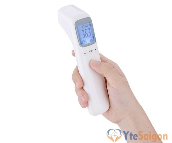 - Đưa nhiệt kế lên trán hoặc tai để đo nhiệt độ. Để ở khoảng cách 3-5cm