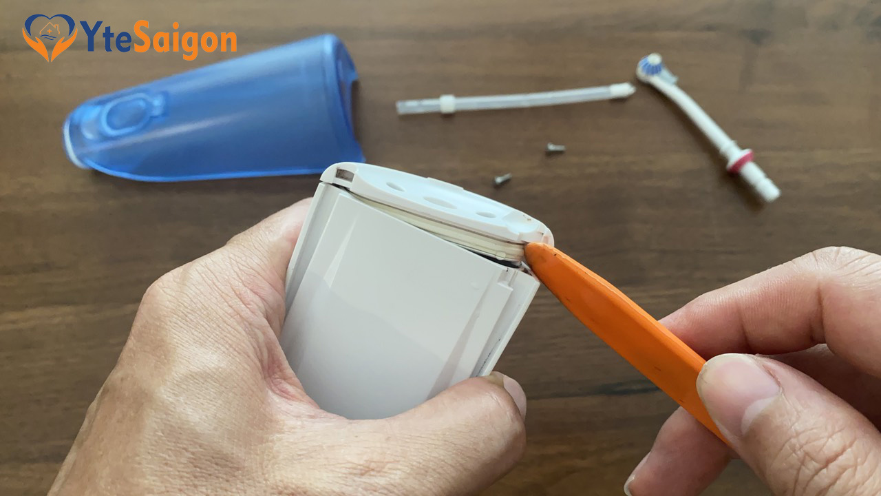 Bước 3: tiếp theo bạn tiếp tục cạy nắp ở trên đầu máy tăm nước. Công việc này khá đơn giản.